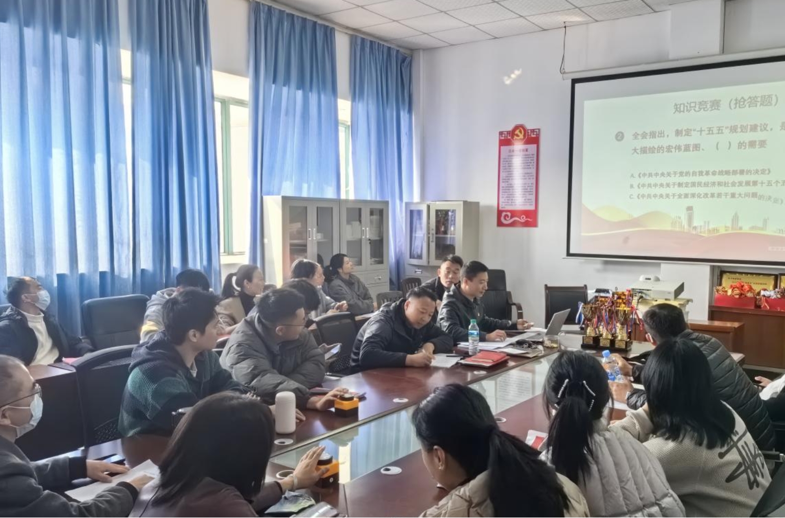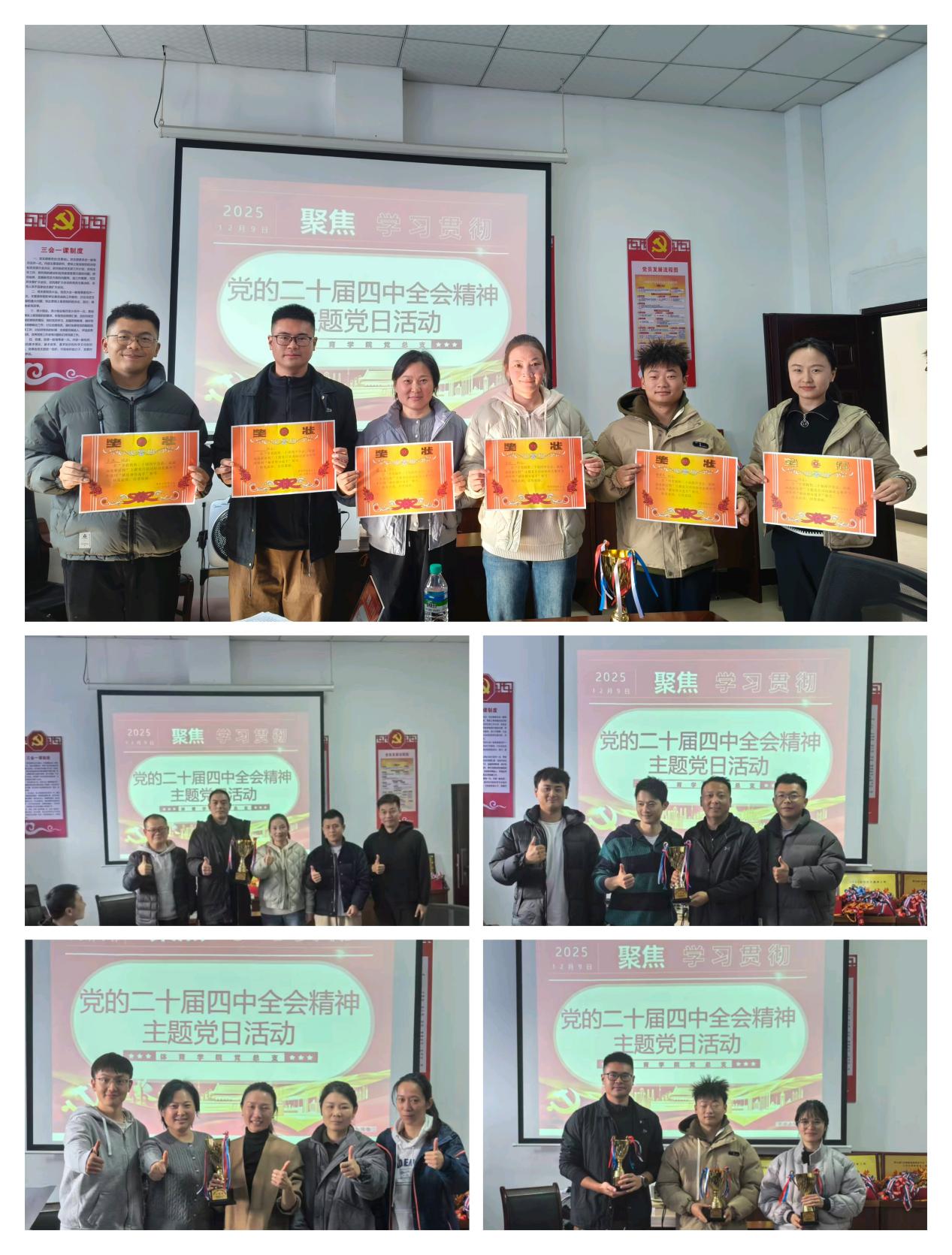 为深入学习贯彻党的二十届四中全会精神,12月9日中午,体育学院党总支在体育大楼三楼党员活动室开展“学思践悟党的二十届四中全会精神,砥砺奋进新征程 ”知识竞赛主题党日活动,学院全体党员组成6支代表队参与本次活动。