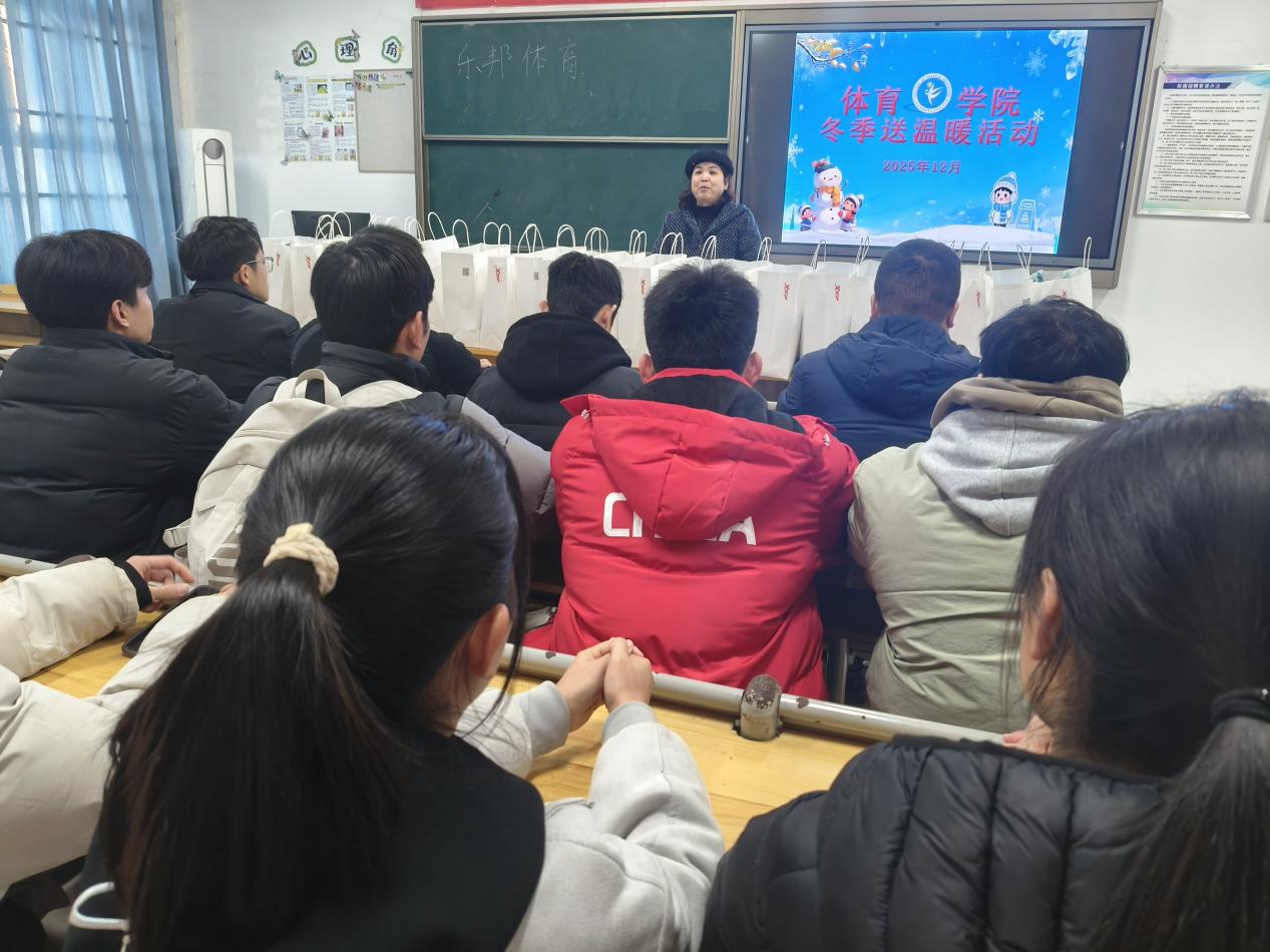 为切实落实学校党政对困难家庭学生的关爱举措,让困难学生度过一个“温暖、愉悦”的冬天,营造和谐友爱的校园氛围,2025年12月25日中午,体育学院在体育大楼101教室隆重开展“冬季送温暖”物资发放活动。学院党总支副书记刘晓芬、全体辅导员及21名经前期推选确定的困难家庭学生参加了此次活动。